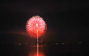 夜になり、すぐ目の前の湖から打ち上げられる花火は、圧倒的な迫力と美しさで夜空と湖面を彩ります。
